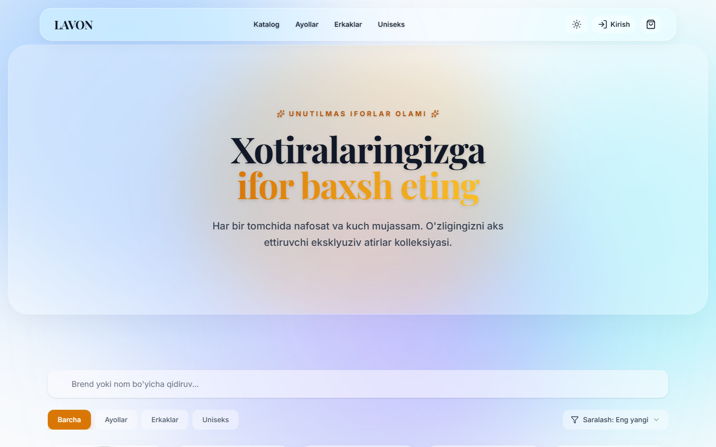 Xotiralaringizga ifor baxsh eting. Har bir tomchida nafosat va kuch mujassam — eksklyuziv atirlar kolleksiyasi. To'liq e-commerce platforma Next.js va Firebase asosida.